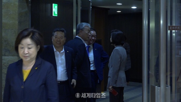 | ▲ 26일 국회본회의장 입구에서 정의당 심상정 대표가 의견을 나누고 있는 자유한국당 나경원 원내대표와 대안정치연대 유성엽 ·장병완 의원을 지나치고 있다. |
