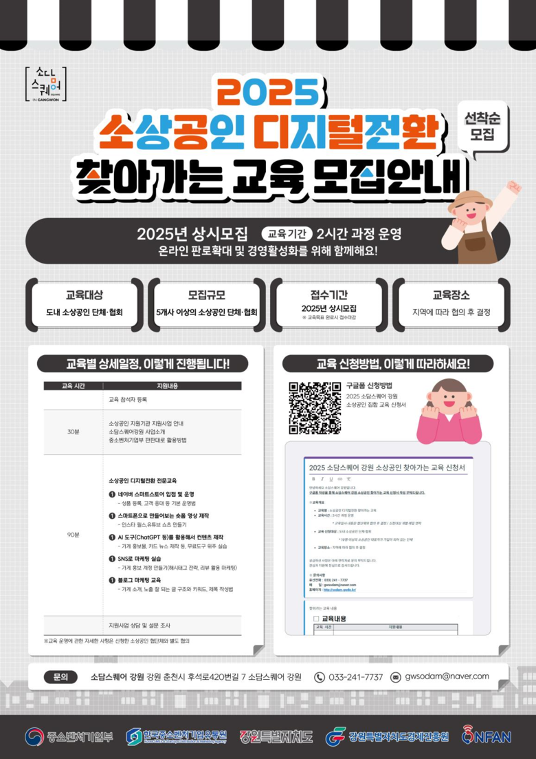 지원사업 및 교육 신청은「소담스퀘어 강원」홈페이지(sodam.gwdo.kr), 판판대로 홈페이지(fanfandaero.kr)에서 가능하며, 소상공인이면 누구나 무료로 참여할 수 있다.