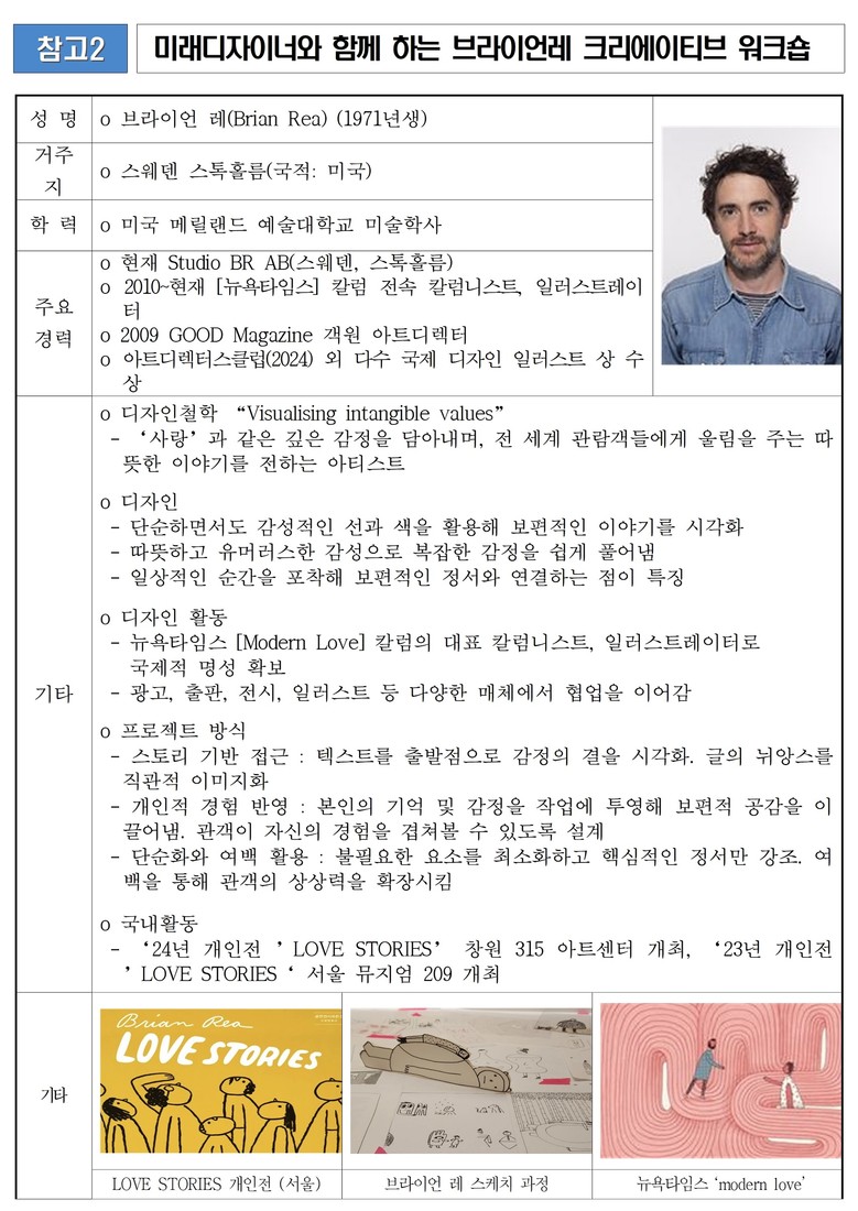 한편,「글로벌 디자이너와 연계한 도시브랜드 굿즈 디자인 개발」을 함께하는 디자이너 브라이언 레는 뉴욕타임스 칼럼니스트로 활동하며, 감성적인 소묘(핸드드로잉) 스타일로 유·무형적 서사를 표현하는 예술가다.
