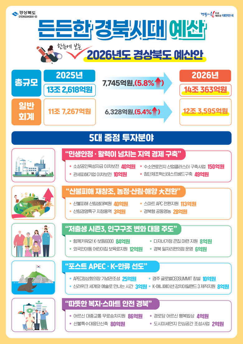 이철우 경북도지사는 “올해 경상북도는 초대형산불피해라는 큰 위기를 슬기롭게 극복하고, 역대 가장 성공적인 APEC 개최를 기회로 경북의 힘을 세계에 알리는 이정표를 세웠다. 이러한 성과에도 어려운 경제와 위기에 처한 민생을 보살피고 챙기는 도정의 책임과 역할은 여전히 막중하다”며 “이번 예산을 민생의 어려움을 덜고, 지역경제에 새 숨을 불어넣으며, 미래세대가 꿈꾸고 살아갈 수 있는 경북시대를 만드는 마중물로 삼아 도정 추진에 최선을 다하겠다”며 각오를 다졌다.