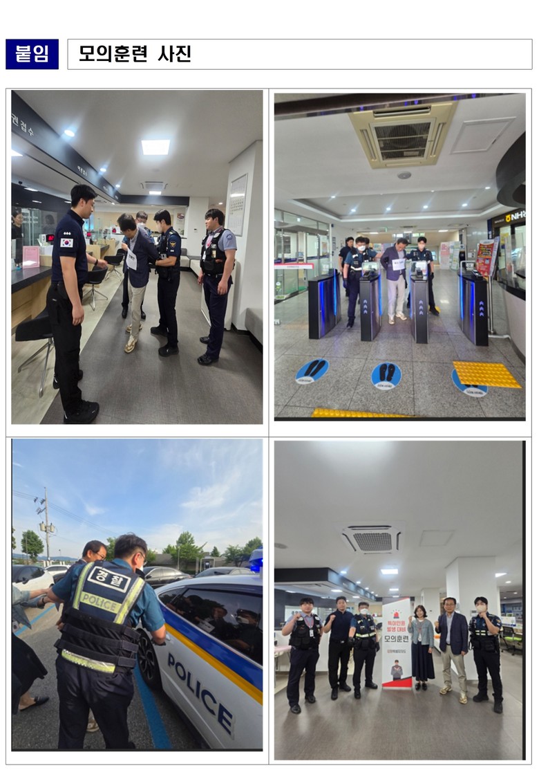 이번 훈련은 민원인의 폭언·폭행 상황을 가정하여, ▲상급자 및 청원경찰의 적극 개입 ▲사전 고지 후 웨어러블 캠 녹화장비 작동 ▲비상벨 호출(112 종합상황실 연계) ▲피해 공무원 보호 ▲현장 경찰 인계 등 단계별 시나리오에 따라 진행되었다.