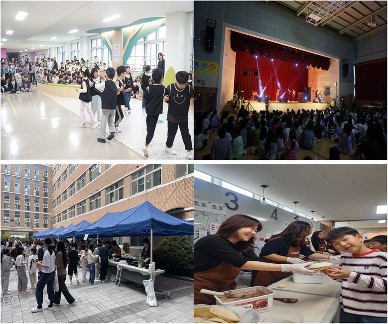 | ▲ 지난 15일과 16일, 소담초등학교에서 ‘2024 놀담먹담꿈꾸담 소담교육 가족 축제’가 열리고 있다(상단 좌측: 강강술래를 하는 모습, 상단 우측:학생들이 공연하는 모습, 하단 좌우측: 학부모회에서 준비한 먹거리 부스 모습) |