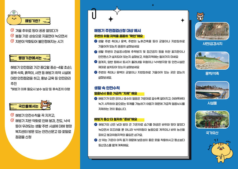 시 관계자는 "해빙기에는 옹벽과 석축, 사면 등에서 안전사고 위험이 커진다"라며 "생활 주변에 위험이 우려되는 시설물이 있으면 주민점검신청제를 적극적으로 활용해 주길 바란다"라고 말했다.
