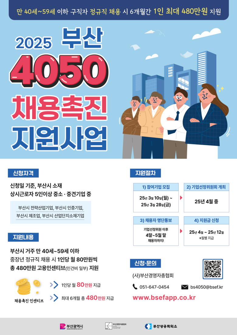 ◈ 3.10.~3.28. 참여기업 모집… (사)부산경영자총협회 누리집 또는 전자우편[(사)부산경영자총협회, 부산상공회의소]을 통해 신청하면 돼 [부산 세계타임즈=이용우 기자] 부산시(시장 박형준)는 「2025 부산 4050 채용촉진 지원사업」에 참여할 기업을 오늘(10일)부터 3월 28일까지 모집한다고 밝혔다.