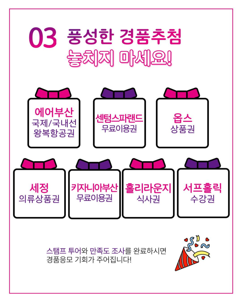 또한, ▲부산가족축제 홍보물을 공유하는 ‘재잘재잘 소문내기 이벤트(~5.16.)’ ▲가족의 특별한 순간을 나누는 ‘우리가족이 빛나는 순간’ ▲가족의 소중한 가치를 발견하는 ‘우리가족의 빛나는 가치’ 이벤트도 진행된다.