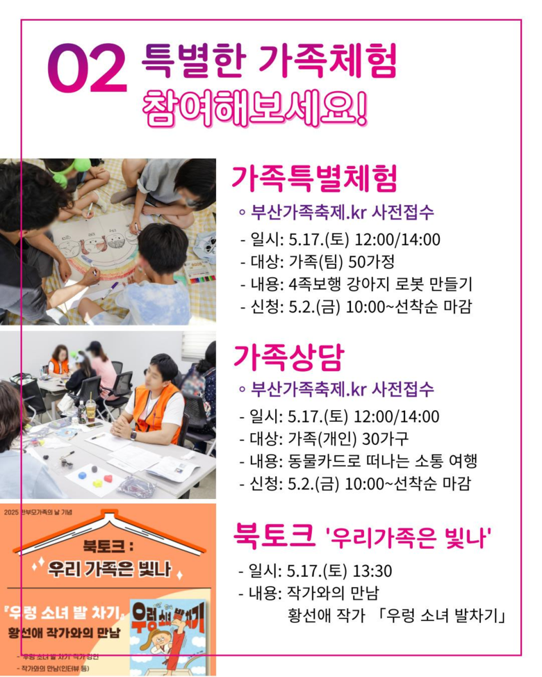 ◈ 5.25.까지 부산가족축제 공식 누리집(부산가족축제.kr)을 통해 온라인으로도 축제를 즐길 수 있어… 12개 가족체험과 여러 이벤트에 참여할 수 있어