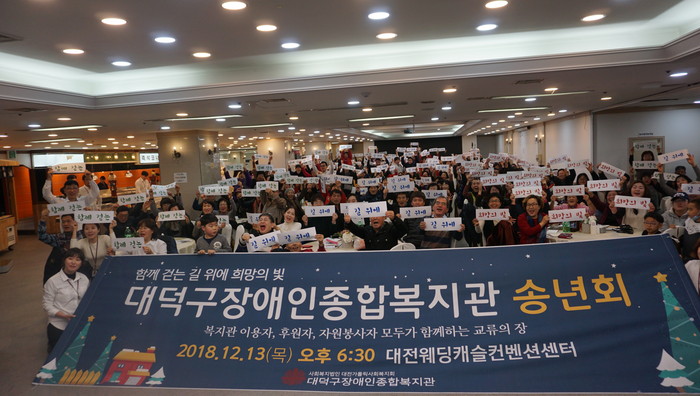 [대덕구=세계타임즈 이장성 기자] 대덕구장애인복지관(관장:안광훈)은 2018 ‘함께 걷는 길 위에 희망의 빛’ 송년회를 13일(목) 대전웨딩캐슬컨벤션센터 지하 1층에서 후원자, 자원봉사자, 이용자 및 가족 350여분과 함께 진행했다.