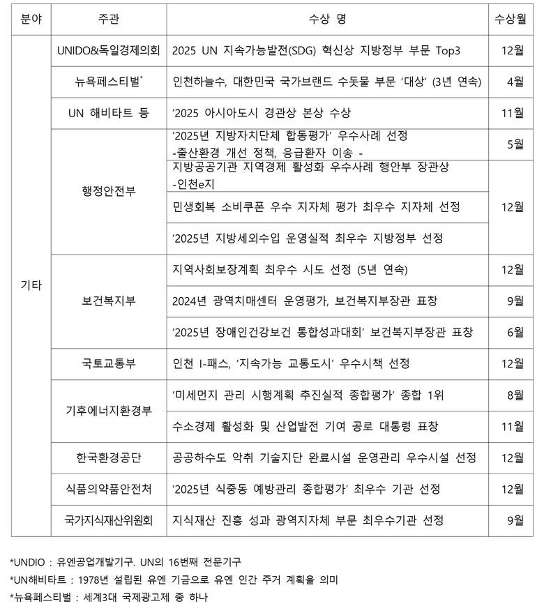 *인천시는 지난 10월 31일(현지시간) 콜롬비아 보고타에서 개최된 ‘2025 세계 도시의 날 기념식*((World Cities Day)’에서 ‘2025 유엔(UN) 글로벌 지속가능발전 도시상(Shanghai Award)*’을 수상하며 전 세계 ‘지속가능 도시모델’로 선정됐다.