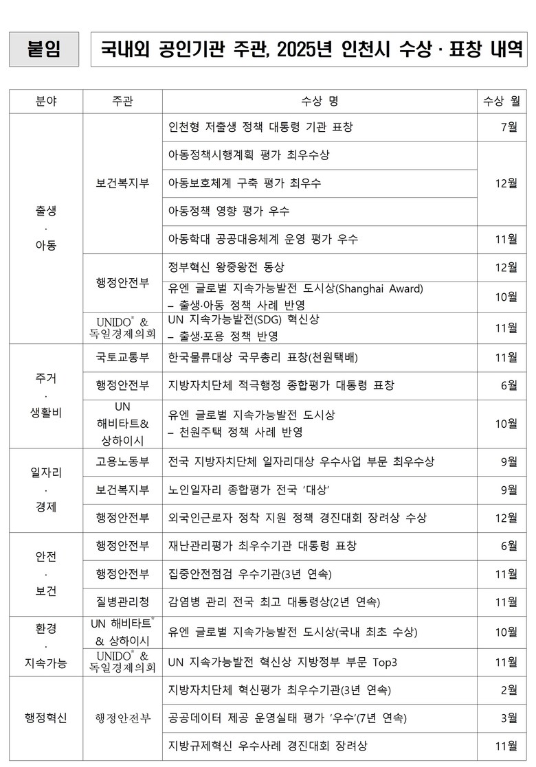 2025년 인천 정책 성과의 정점은 국제 무대였다. 인천시는 국내 최초로 ‘유엔 글로벌 지속가능발전 도시상’을 수상*한 데 이어, UN SDG 혁신상을 2년 연속 수상하며 글로벌 지속가능도시 Top3**에 이름을 올렸다.