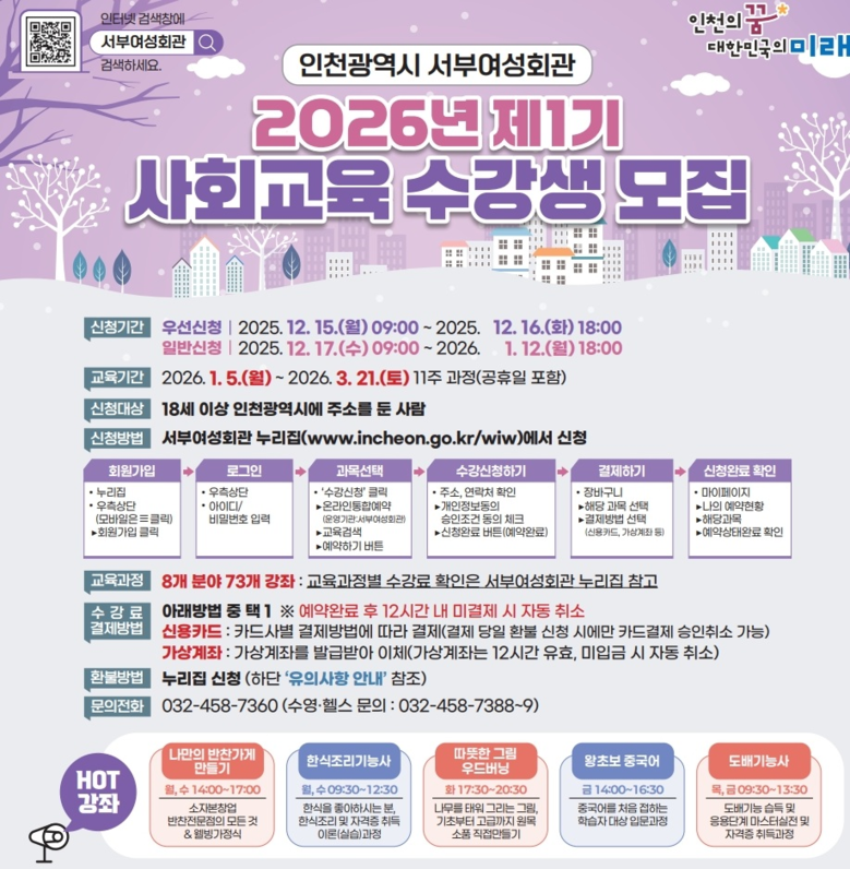 [인천 세계타임즈=심하린 기자] 인천광역시(시장 유정복) 서부여성회관은 오는 12월 17일부터 2026년 제1기 사회교육 프로그램 수강 신청을 받는다고 밝혔다.