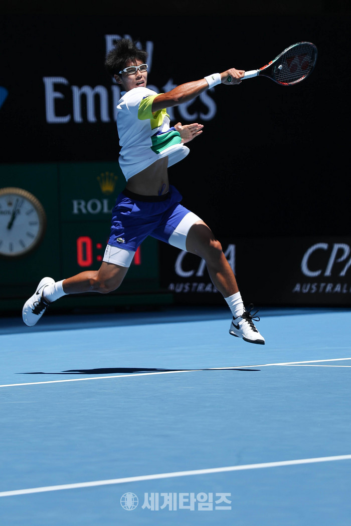 정현이 19일 호주 멜버른에서 열린 2017 호주오픈대회 2회전에서 그리고르 디미트로프(불가리아)와 경기를 하고 있다. 이날 정현은 세트스코어 1-3(6-1 4-6 4-6 4-6)으로 역전패를 당해 3회전 진출에 실패했다. 2017.01.19. (사진=대한테니스협회 제공)