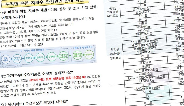 안내자료는 지하수의 개발 및 이용에 대한 법적 절차, 먹는물 수질 기준에 대한 정의 및 기준, 그리고 지난해 가장 부적합률이 높은 항목에 대한 원인 및 영향, 대책을 간단하고 쉽게 요약·정리되어 있다.
