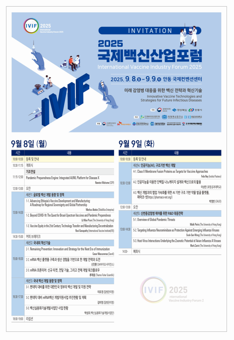 포럼은 전염병 대응 혁신 연합(CEPI) 소속의 뉴턴 와호메(Newton Wahome)박사의 ‘팬데믹 대비 엔진: 질병 X 대응을 위한 통합 AI/ML 플랫폼’ 주제 강연을 시작으로, 국내외 백신 개발 동향과 정책, 국내외 혁신 기술, 인공지능(AI) 구조 기반 백신 개발, 신변종 감염병 제어를 위한 R&D 대응 전략 등을 주제로 이틀간 집중적으로 논의했다.