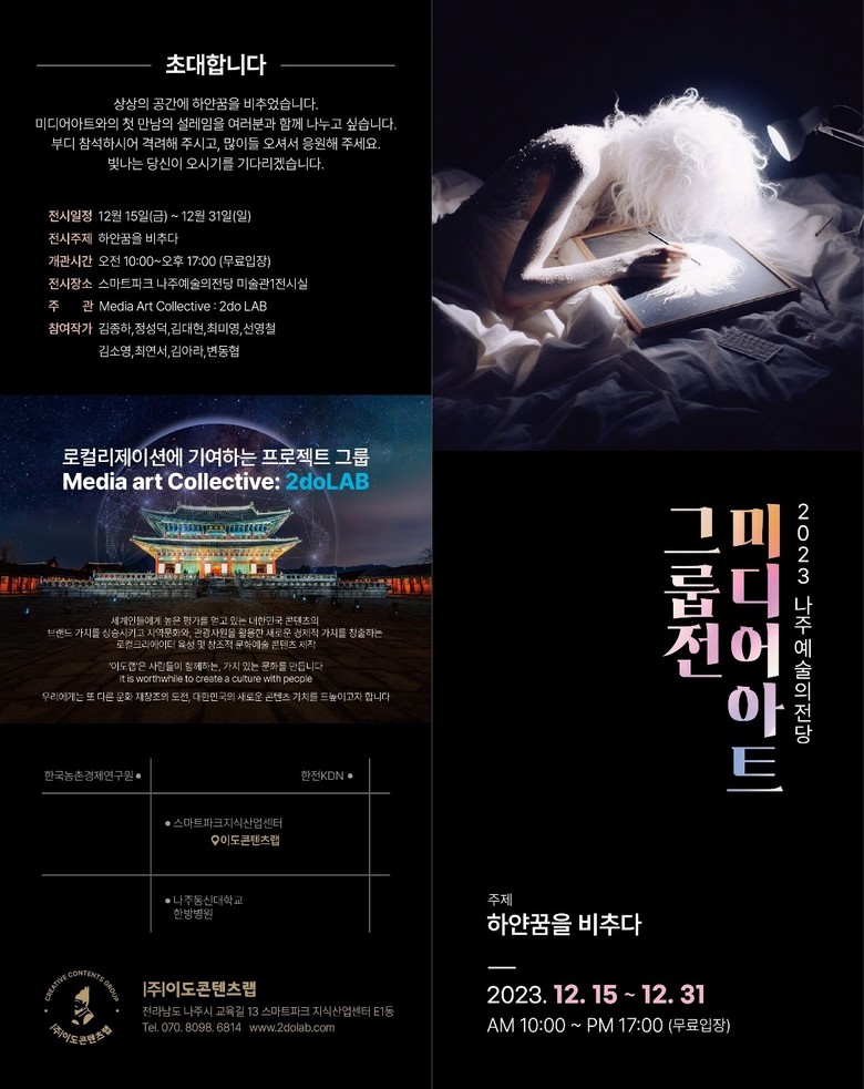 [세계타임즈]최성룡기자 = 전라남도 나주의 나주예술의 전당에서 2do LAB라는 미디어 아트 콜렉티브의 그룹 전시회가 화려하게 열렸습니다. 이번 전시회는 '하얀 꿈을 비추다'라는 주제로 개최되었으며, 12월 15일부터 12월 31일까지 진행됩니다. 이 전시회는 디지털 예술의 새로운 영역을 개척하며, 방문객들에게 꿈과 현실이 교차하는 특별한 경험을 선사합니다.