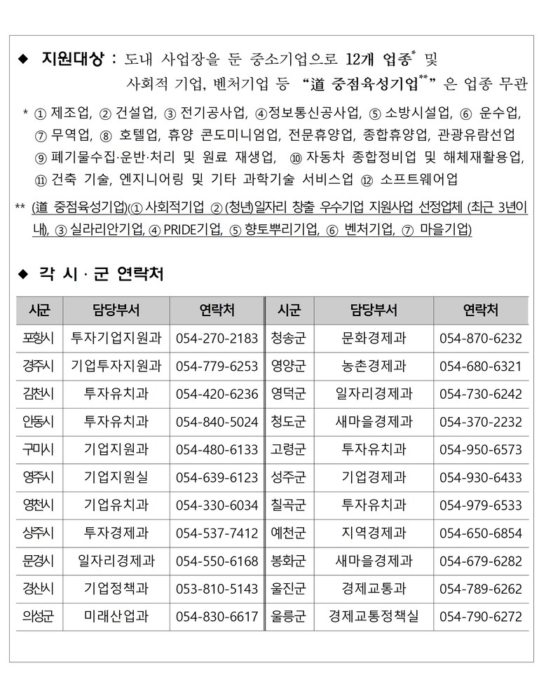 지원 기준과 취급 은행, 제출 서류 등 자세한 사항은 경상북도 홈페이지를 비롯해 시군 홈페이지, (재)경상북도경제진흥원 홈페이지, 경상북도중소기업육성자금시스템(www.gfund.kr)을 통해 확인할 수 있다.