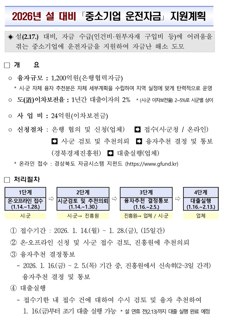 [경북 세계타임즈=한윤석 기자] 경상북도는 설 명절을 앞두고 최근 고물가·고환율 등으로 경영에 어려움을 겪고 있는 지역 중소기업의 자금난 해소를 위해 1,200억원 규모의 중소기업 운전자금을 지원한다.