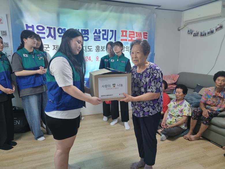 이날(7일) 오전, 보은여고 청소년적십자(RCY)단 25명 학생들은 청주에 위치한 대한적십자사 충북지사 내 제빵 제작소를 방문하여 지역사회 경로당 어르신들에게 드릴 마들렌과 단팥빵 200여 개를 만들어 보은군 관내 삼산 6구에 소재한 경로당으로 향했다.