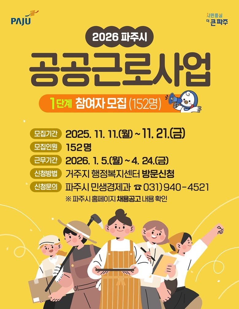 한편, 오는 5월부터 시작되는 ‘2026년 2단계 공공근로사업’ 참여자 모집은 3월 중순경 진행될 예정이며, 자세한 사항은 파주시청 누리집을 통해 확인할 수 있다.