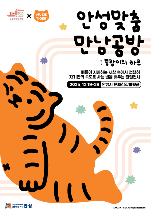 ○ 포토존·체험·도심투어 등 시민 참여 중심의 문화콘텐츠 제공 [안성시 세계타임즈=송민수 기자] 안성시 문화창작플랫폼은 12월 19일부터 28일까지 인기 캐릭터 ‘무직타이거(뚱랑이)’와 함께하는 연말 팝업전시 「안성맞춤 만남공방: 뚱랑이의 하루」를 개최한다. 시민들이 쉽고 즐겁게 문화 프로그램을 경험할 수 있도록 포토존, 체험형 프로그램, 구도심 연계 투어 등 다양한 콘텐츠를 마련했다.