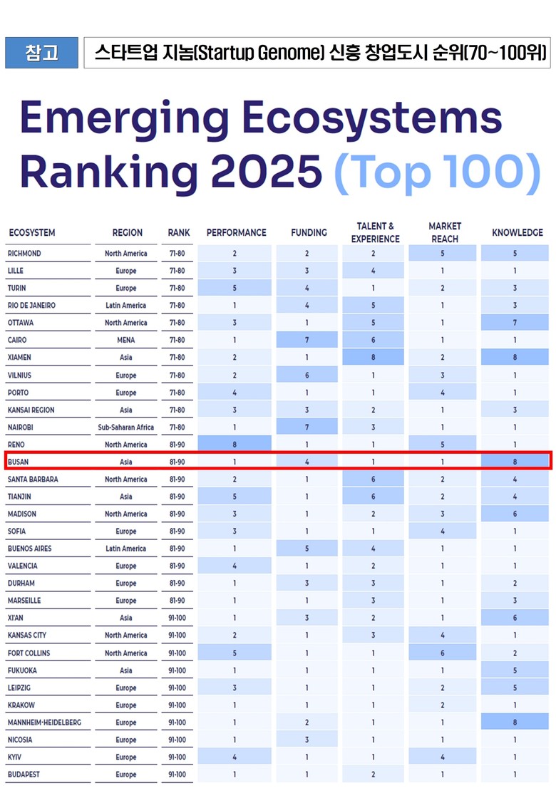 이번 평가 순위는 환동해안권역 도시인 일본 후쿠오카(90위권)에 앞서는 것으로, 부산의 환동해안권 창업 선도 도시로서의 입지가 재확인됐다.