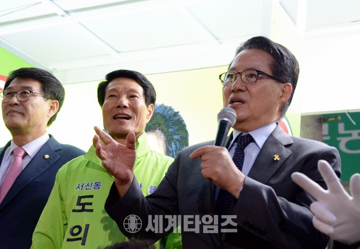 박지원 국민의당 대표가 8일 전북 전주시 서신동 신일아파트 앞 사거리에서 오는 12일 치러지는 도의원 보궐선거(전주시 제4선거구)에 대한 지원 유세를 펼치고 있다. 2017.04.08.