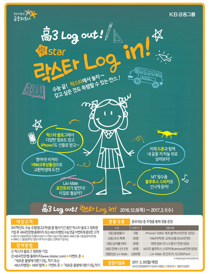 참여방법은 KB락스타 블로그 정회원 가입 후 KB국민은행 홈페이지 또는 KB스타뱅킹을 통해 이벤트에 응모하면 된다.