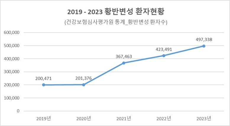 건강보험심사평가원에 따르면 2019년 200,471명이었던 황반변성 환자수가 2023년에는 497,338명으로 늘어 최근 5년동안 약 2.5배 증가한 것으로 나타났다