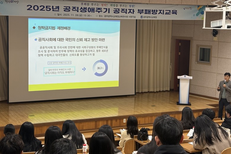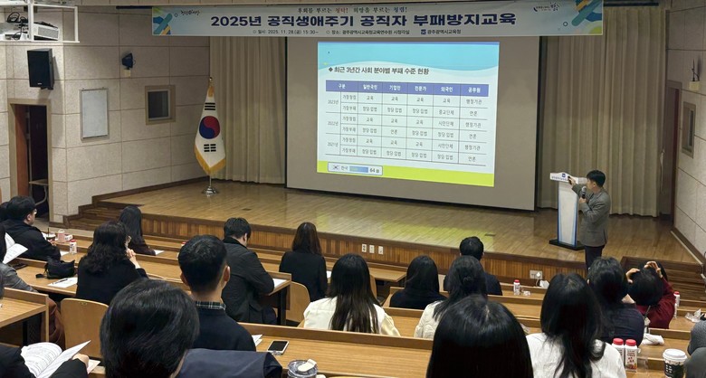 [광주 세계타임즈=손권일 기자] 광주시교육청(교육감 이정선)은 28일 광주시교육청교육연수원 시청각실에서 ‘공직생애주기 공직자 부패방지교육’을 실시했다.