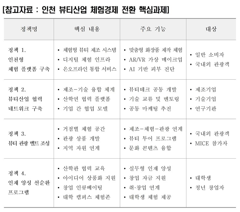 인천연구원의 민규량 연구위원은 “인천의 우수한 제조 역량을 체험경제와 결합하면 K-뷰티의 생산 심장부를 소비와 경험의 중심지로 전환할 수 있다”라며, “체계적인 정책 지원과 기업의 인식 전환이 함께 이뤄져야 한다”고 강조했다.
