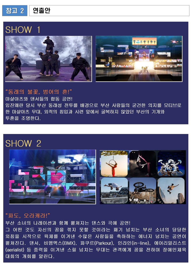 ◈ [쇼(Show) 1 동래의 불꽃, 범어의 혼!] 마샬아츠(Martial arts) 선수들과 댄서들의 합동 공연, 역사 속에서 굴복하지 않았던 부산의 기개와 투혼 연출, [쇼(Show) 2 파도, 오라캐라!] 비엠엑스(BMX), 파쿠르 [부산 세계타임즈=이용우 기자] 부산시(시장 박형준)는 25년 만에 부산에서 개최되는 「제45회 전국장애인체육대회」 개회식이 오는 10월 31일 저녁 5시에 부산아시아드주경기장에서 열린다고 밝혔다.