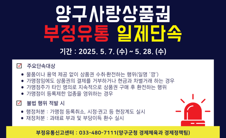 이를 위해 양구군은 부정 유통 방지를 위한 합동 단속반을 편성하고 상품권 부정 유통 일제 단속 홍보, 이상 거래분석, 이상 거래 발생 가맹점 현장 조사, 위반행위 적발 후속 조치 등을 실시할 예정이다.