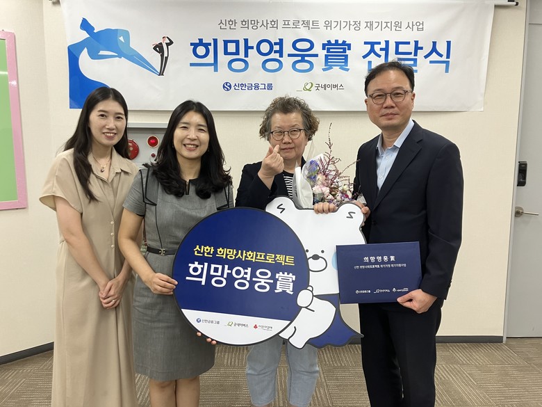 이날 전달식은 신한은행 북부본부에서 진행됐으며, 최우현 신한은행 북부본부장, 유혜선 굿네이버스 서울본부장, 64번째 ‘희망영웅’ 수상자 이미선 씨가 참석했다.
