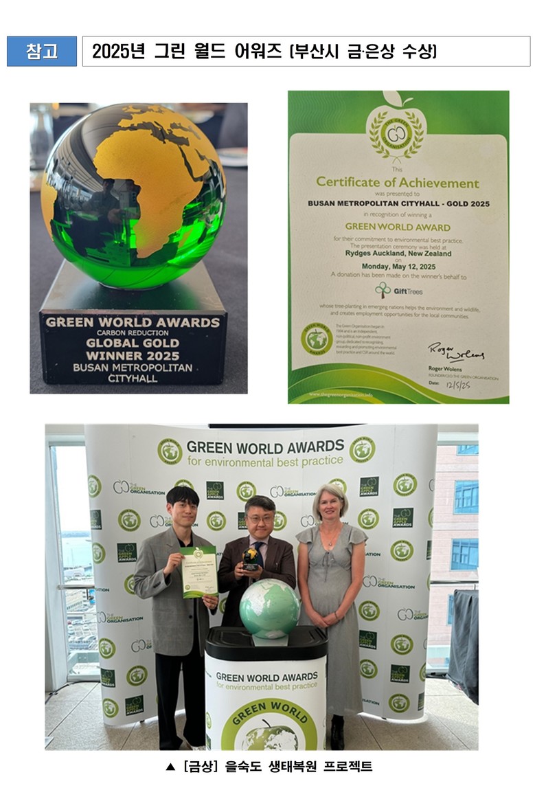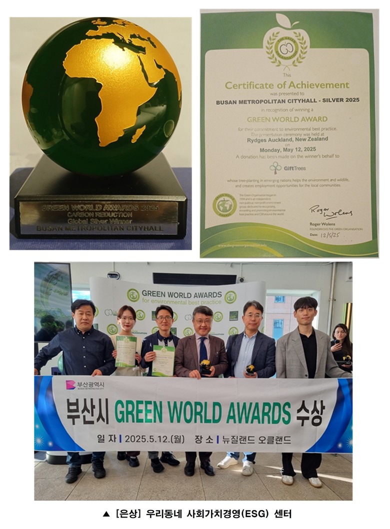 ◈ [은상] '우리동네 사회가치경영(ESG) 센터'는 시니어 인력을 활용해 지역 내 폐자원을 선순환하는 정책으로, 지속 가능 [부산 세계타임즈=이용우 기자] 부산시(시장 박형준)는 지난 12일 뉴질랜드 오클랜드에서 열린 「2025년 그린 월드 어워즈(Green World Awards 2025)」 시상식에서 '을숙도 생태복원 프로젝트'가 금상, '우리동네 사회가치경영(ESG) 센터'가 은상을 수상했다고 밝혔다.