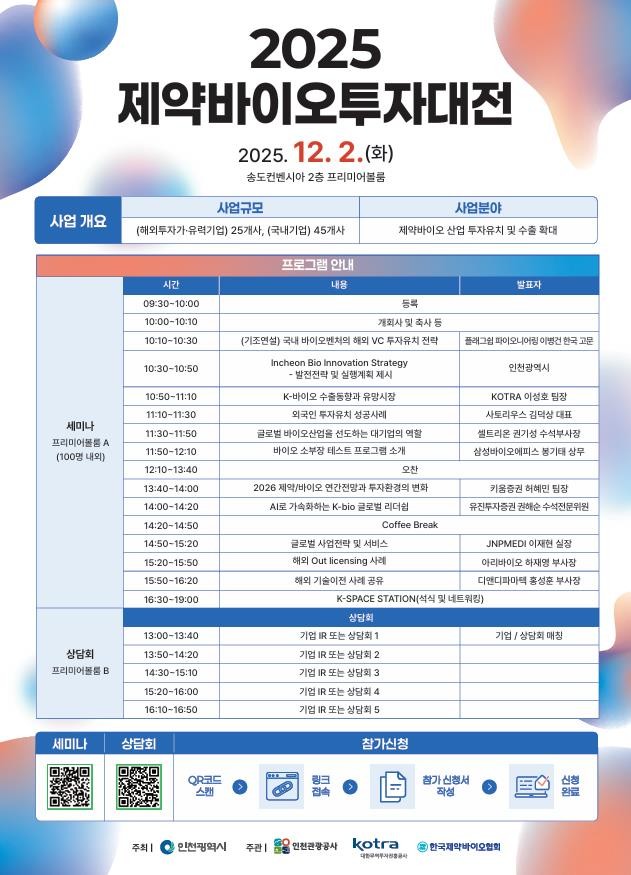 오후 세션에서는 키움증권과 유진투자증권이 ‘2026년 투자환경 변화와 제약‧바이오산업의 AI 가속화’를 주제로 미래 투자 방향을 제시하고, 아리바이오, 디맨디파마텍, JNPMEDI 등 유망 기업들이 ‘해외 기술이전 사례 및 글로벌 사업전략’을 공유한다.