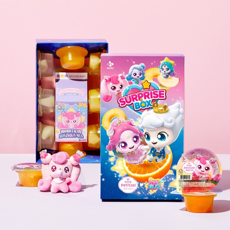 우선 ‘쁘띠첼 & 캐치! 티니핑 서프라이즈 박스’를 출시, ‘카카오톡 선물하기’에서 지난달 28일부터 판매를 시작했다. 서프라이즈 박스는 쁘띠첼 과일젤리 8개(복숭아 3개, 파인애플 3개, 밀감 2개)와 티니핑의 인기 굿즈인 ‘베이비 티니핑 키링’ 인형(8종 가운데 랜덤 1개)으로 구성됐다.