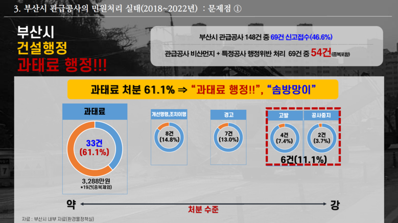 그러나 이에 대한 행정처분은 과태료가 61.1%로 가장 많고, 시와 사업자에게 절대적으로 유리한 경고 중심의 행정이 90%를 차지하는‘솜방망이 처분’으로 일관하고 있어, 부산시민이 받는 피해와 고통에 원천적으로 치유하는 조치가 될 수 없다고 지적하였다.* (PT 2, 3)
