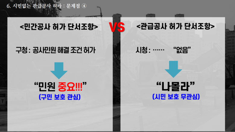 주민의 관급공사 소음.진동과 직접 관련된, 16개 구.군 생활환경 관리인력의 경우에도 52명으로, 2021년 기준으로 보면 1인당 301건의 민원을 담당하는 것으로, 관급공사의 심각한 소음과 진동 민원에 제대로 대응할 수 없는 구조적 문제점을 안고 있고, 이로 인해서 관급공사 소음과 진동에서 시민 보호를 위한 정상적인 행정구현은 불가능하다고 지적하였다. (PT 7)