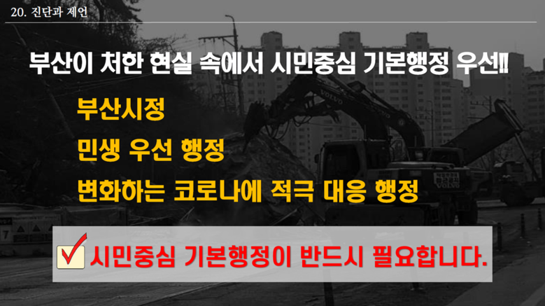 이에 오랜시간 관행으로 포장되어 이어져 온 부산시의 여러 부실한 시정에 대해서는 지금이라도 과감하게 개선하고 버릴 것을 주문하면서, 부산시민에게 가장 필요한 ‘시민 중심의 기본행정’을 정립하여 강력하게 추진해 나갈 것을 당부하였다. (PT 16~22)