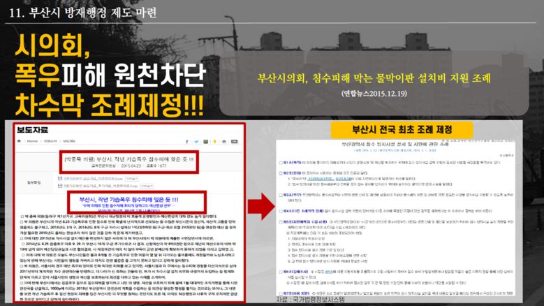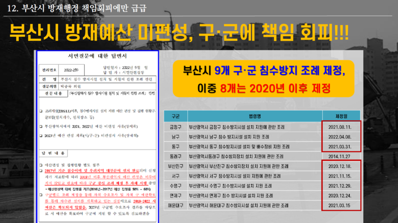 한편, 박 의원은 부산시의 부실한 행정은 비단 건설행정뿐만 아니라 침수와 같은 방재행정에서도 드러났다고 지적하였다. 부산시의회 주도로 차수막과 관련한 침수 방지시설 조례를 광역자치단체 최초로 제정하였지만, 조례 제정 이후 5년간(2018~2022년) 예산을 전혀 편성하지 않아, ‘부실 방재행정’관행에서 벗어 나지 못한다고 강력히 질타하였다. (PT 11~12)