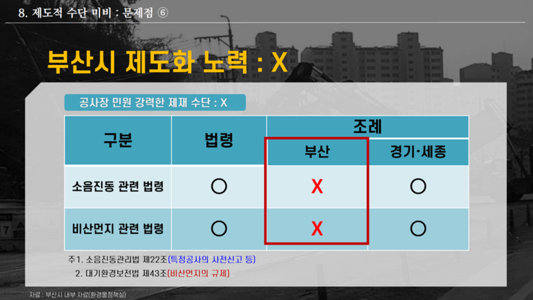 다음으로 제도적 조치로는 광역 시.도에서 공사장의 생활소음과 진동, 비산먼지로부터 도민과 시민을 보호하기 위한 지원조례를 만들고 있음을 설명하였다. 이에 박 의원은 지금이라도 부산시민을 보호하기 위한 적극적인 제도마련이 필요하다고 강력히 주장하였다. (PT 8~10)