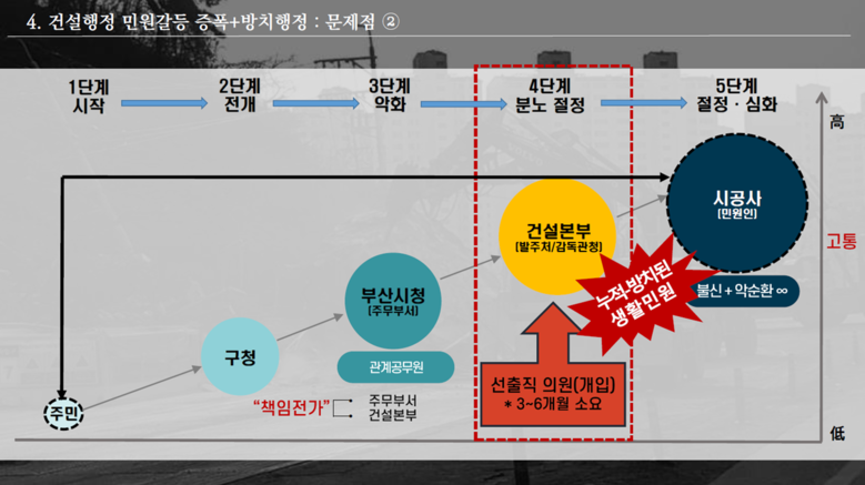 박 의원이 주민들의 민원을 실제 분석해본 결과, 부산시의 관급공사장 관련 민원은 ‘구청→시청→건설본부→시공사’로 이어지는‘핑퐁(탁구공)의 악순환 구조’로 고착화되어 있으며, 주민의 대의기관인 시의원 등 선출직이 개입해야만 겨우 대책을 강구하는 무사안일한 ‘건설행정 관행’이 오랜 기간 지속되고 있다고 질타하였다. (PT 4, 5)