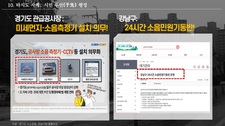 그럼에도, 지방정부의 강력한 의지에 따라 전혀 다른 결과를 만들 수 도 있음을 주장했다. 그 구체적인 예로, 먼저, 행정적 조치로는 경기도의 ‘공사장 소음 측정기.CCTV 등 설치 의무화’와 강남구의 ‘24시간 소음민원기동반’ 운영 등을 소개하였다.