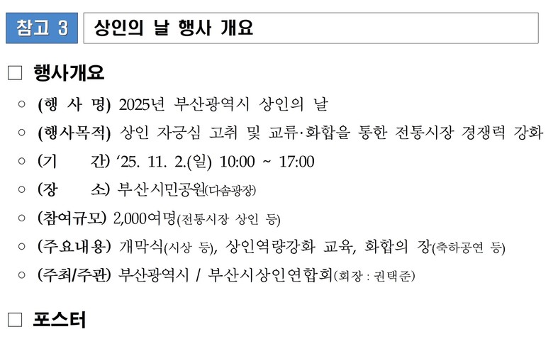 마지막 날인 11월 2일에는 「제3회 부산광역시 상인의 날」 행사가 함께 열린다. 2천여 명의 상인이 참여해 ▲개막식 ▲상인역량강화 교육 ▲축하공연 등 상인 간 화합과 자긍심을 높이는 뜻깊은 자리가 마련된다.