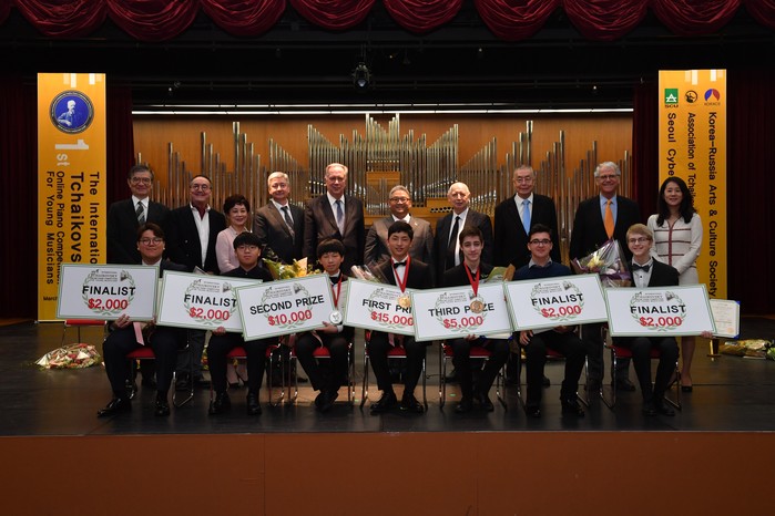 | ▲(뒷줄 왼쪽부터 시계방향으로) 야스오 와타나베(Yasuo Watanabe, 일본)심사위원, 파스칼 네미로프스키(Pascal Nemirovski, 프랑스)심사위원, 이경숙(Kyungsook Lee, 대한민국)심사위원, 블라디미르 오프치니코프(Vladimir Ovchinnikov, 러시아)심사위원, 알렉산더 S.소콜로프(Alexander S. Sokolov, 러시아)심사위원, 학교법인 신일학원 서울사이버대학교 이상균 이사장(Sang Kyun Lee, board chair of the Shinil Educational Foundation & Seoul Cyber University), 영차이콥스키국제콩쿠르협회 회장 안드레이 M. 셰르박(Andrey M. Scherbak, 러시아), 리우 시 쿤(Liu Shih Kun, 중국)심사위원, 타마스 웅가르(Tamas Ungar, 미국)심사위원, 윤소영(Soyoung Yoon, 대한민국)심사위원과 로만 소스닌(Roman Sosnin, 러시아, 만15세), 아드리안 로모프(Adrian Romoff, 미국, 만14세), 3위 알렉산드르 도로닌(Aleksandr Doronin, 러시아, 만16세), 1위 아키토 타니(Akito Tani, 일본, 만15세), 2위 김세현(Saehyun Kim, 대한민국, 만11세), 장준호(Jun Ho Jang, 대한민국, 만13세), 김강현(KangHyun Kim, 대한민국, 만15세) |