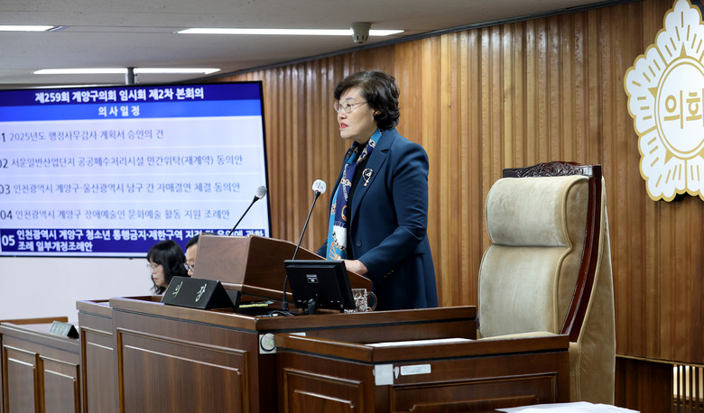 [계양구 세계타임즈=심하린 기자] 인천광역시 계양구의회(의장 신정숙)는 지난 18일 제259회 임시회 제2차 본회의를 열고총 16건의 안건을 처리하며 임시회 일정을 마무리했다.