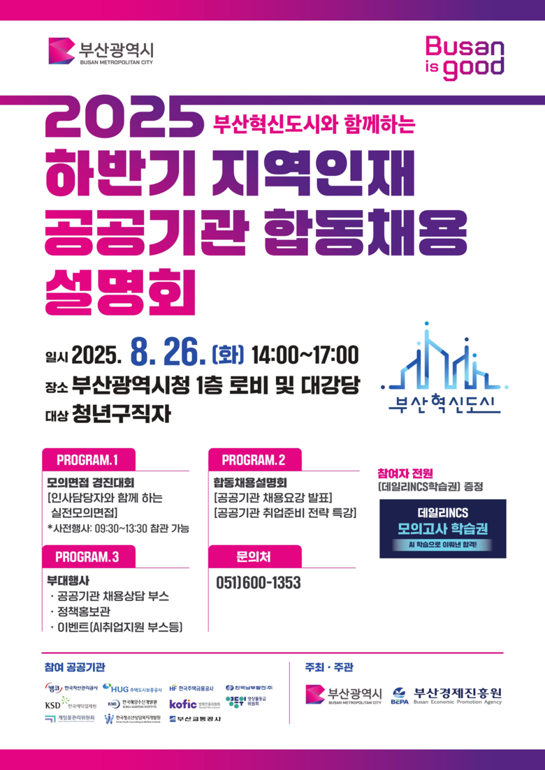 ◈ 09:30~13:30 대강당에서 '공공기관 모의면접 경진대회' 열려… [부산 세계타임즈=이용우 기자] 부산시(시장 박형준)는 내일(26일) 오후 2시 시청 대강당에서 부산 혁신도시와 함께하는 「2025 하반기 지역인재 공공기관 합동채용설명회」(이하 설명회)를 개최한다고 밝혔다.