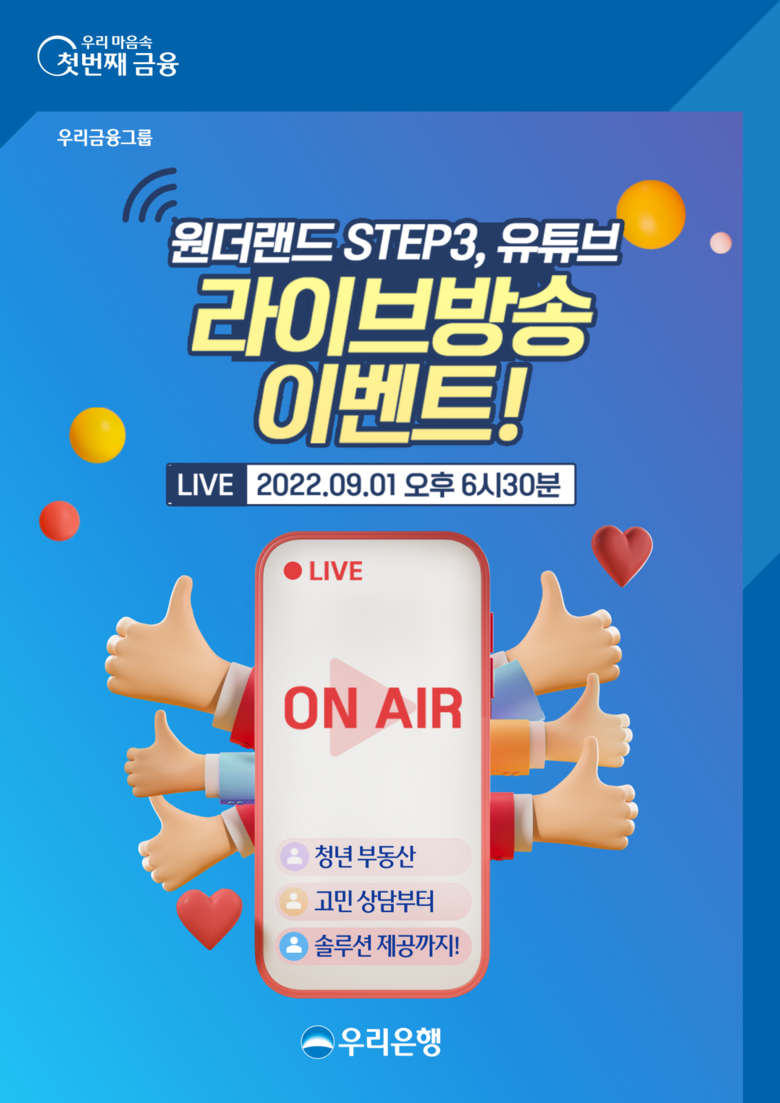 [세계타임즈 = 이송원 기자] 우리은행은 9월 1일 저녁 6시 30분부터 우리은행 유튜브 공식 채널에서 청년 부동산 고민 해결을 위한‘원더랜드 성장기 프로젝트’LIVE 방송을 실시한다고 1일 밝혔다.