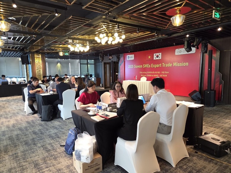 | ▲ 2025년 수원시 중소기업 베트남·싱가포르 수출판매개척단이 베트남 하노이에서 현지 바이어와 수출 상담을 하고 있다. |