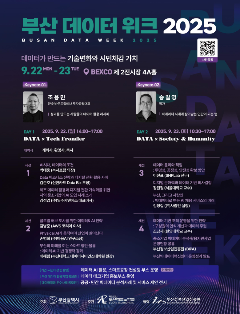 이와 함께 부산 지역 내외 데이터 활용기업들이 참여하는 부스가 운영돼 디지털 전환(DX) 기반의 제품과 해법을 전시하고, 데이터 활용·인공지능 기술 컨설팅도 제공한다.