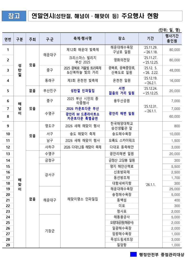한편, 시는 「부산시 안전관리계획 표준안」을 지난 9월에 배포해 주최·주관 없는 연례적 행사까지 통일된 기준으로 관리하고, 안전관리계획 수립 및 심의 절차를 보강하는 등 전년 대비 인파 안전관리 체계를 전반적으로 강화해 안전관리에 만전을 기하고 있다.